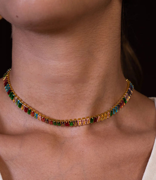 Virgin Mary & Cross Set – Duo of Gold Necklaces with Colored Gemstones