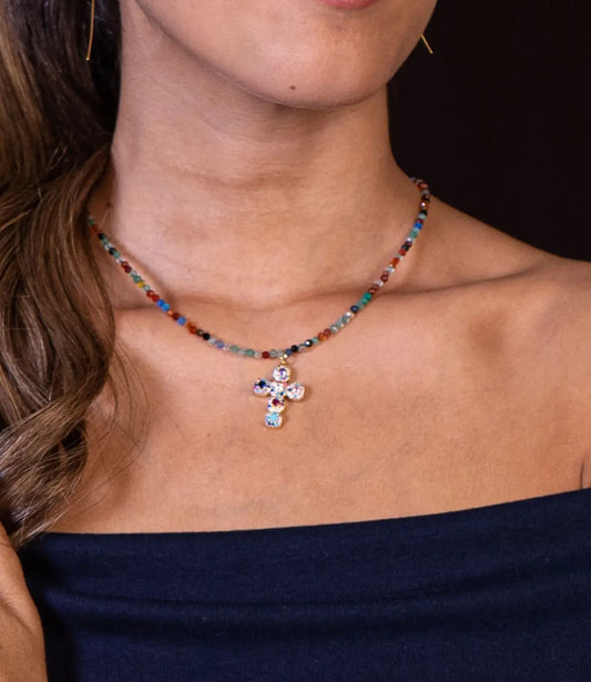 Natural Stone Necklace with Gold Cross Pendant