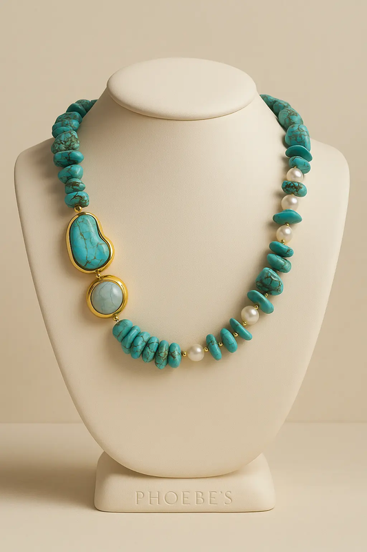 Luxury Turquoise and Pearl Necklace with 18K Gold Plating – Versatile Long or Double Strand