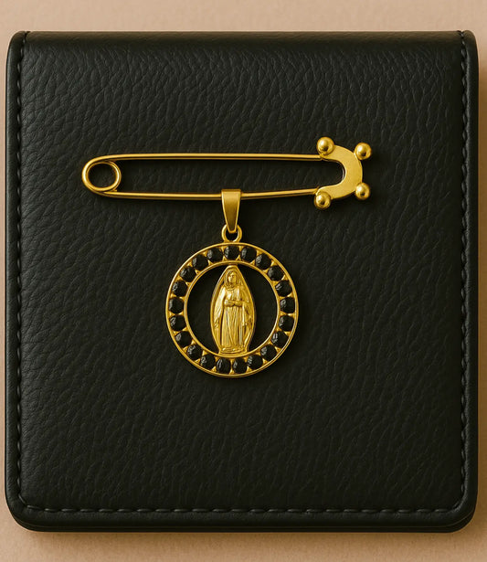 Gold Virgin Mary Medal Brooch with Black Zirconia