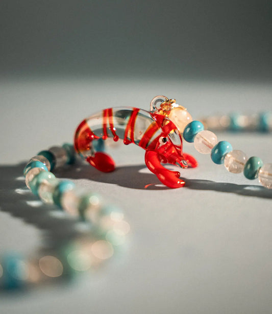 🦞 Fire Lobster – White Quartz and Turquoise Necklace with Glass Pendant