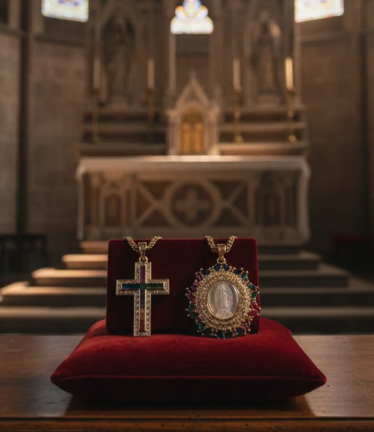 Virgin Mary & Cross Set – Duo of Gold Necklaces with Colored Gemstones