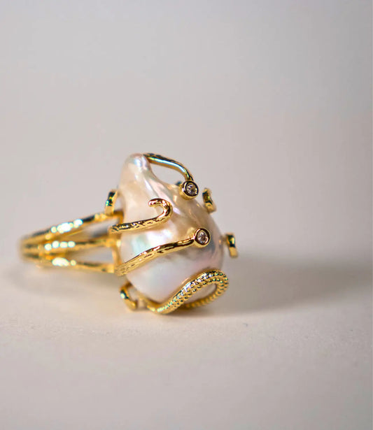 18K Gold-Plated Pink Pearl Necklace and Open Ring Set