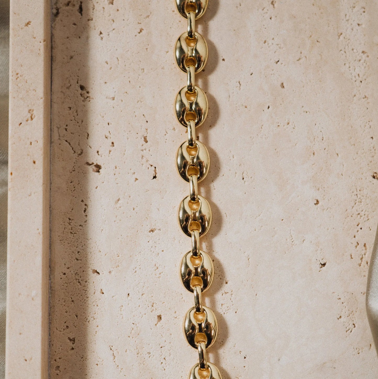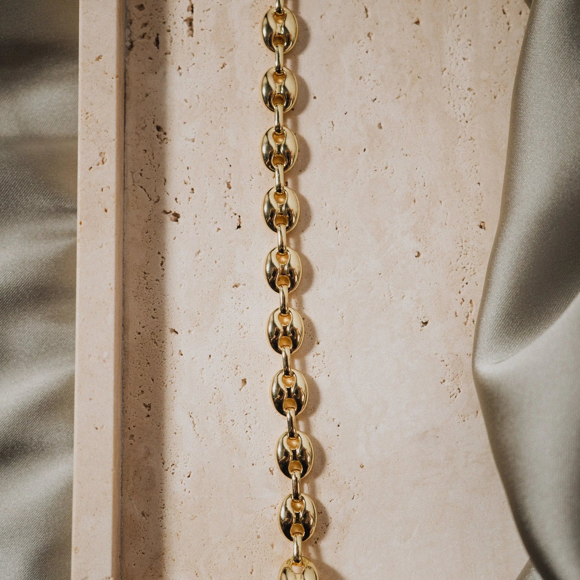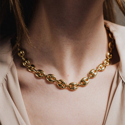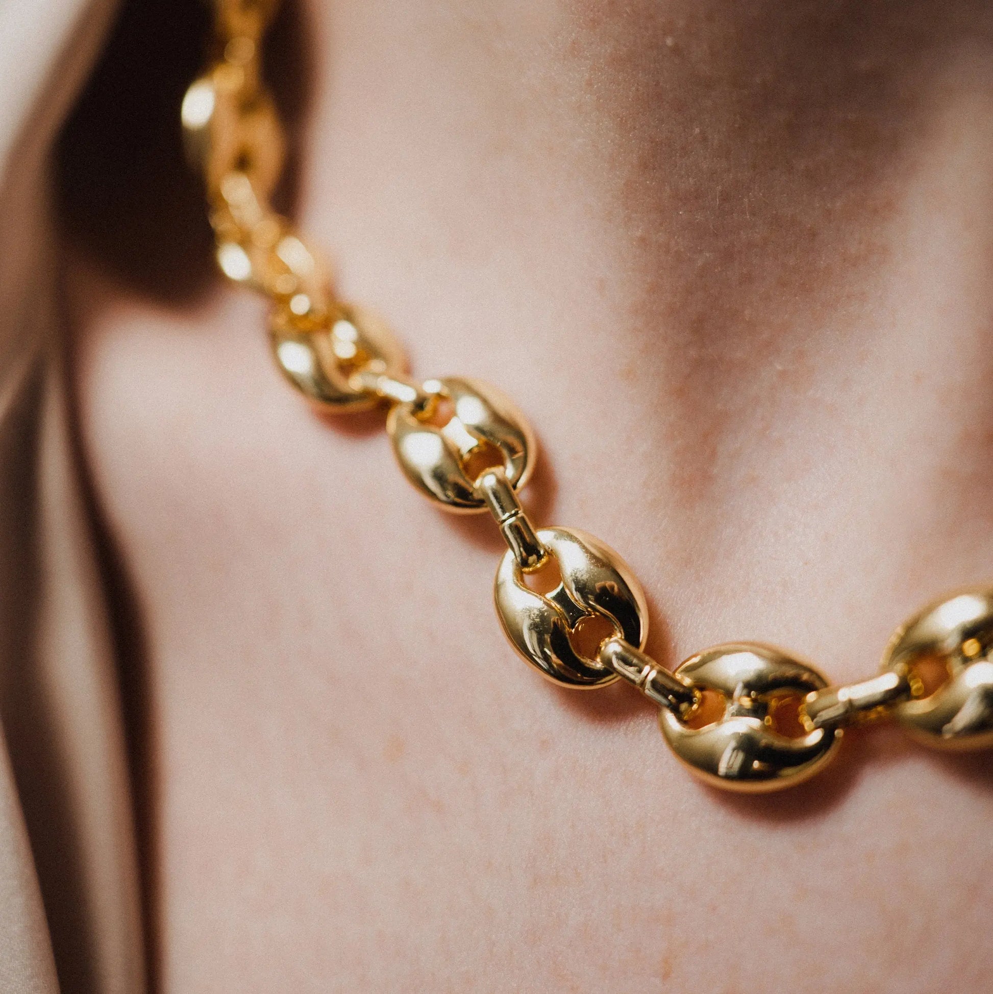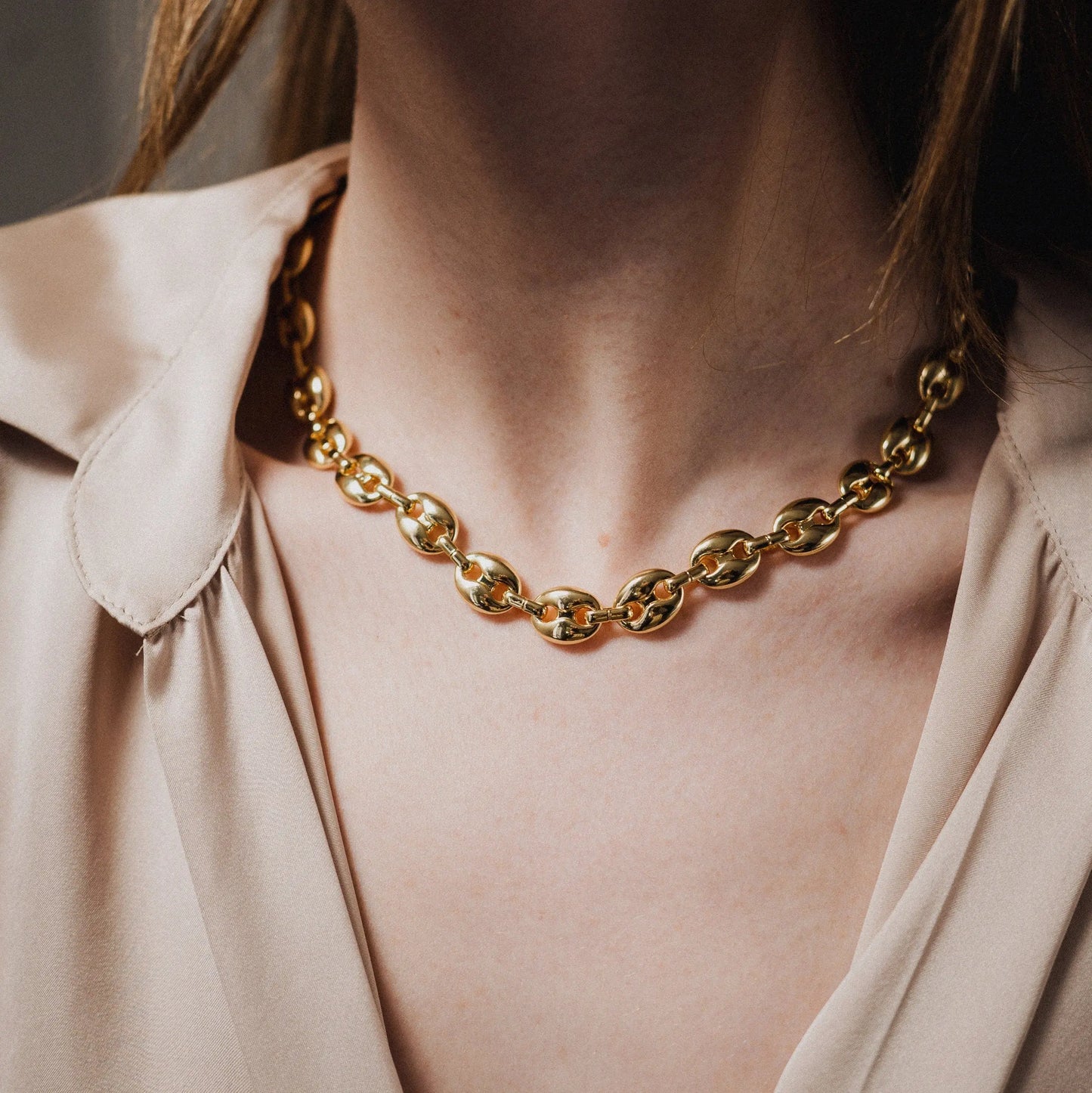 Este collar es una pieza única y elegante, con un diseño de nariz de cerdo gruesa, es una hermosa y llamativa cadena de eslabones que ha sido bañada en oro de 18 quilates. La forma y la textura del collar le dan un aspecto distintivo, que seguramente atraerá miradas y cumplidos de las amantes de la moda. Esta pieza es el regalo perfecto para una mujer elegante y sofisticada que aprecia la belleza de la joyería de calidad.