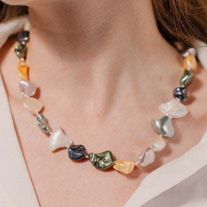 Este conjunto de pulsera y collar de perlas Keshi de agua dulce barrocas, con una variedad de tonos en blanco, oro rosa, mostaza, verde y plata, es una pieza de joyería verdaderamente elegante y sofisticada. Estas perlas Keshi miden aproximadamente 10 mm x 20 mm, lo que las hace destacar de manera impresionante.