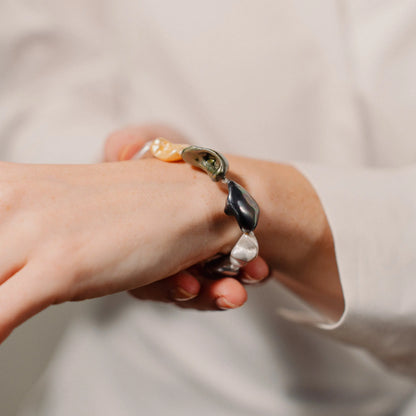 Las perlas de agua dulce Keshi son conocidas por su singularidad y su brillo suave y natural. En este conjunto de collar y pulsera, la mezcla de tonos crea un efecto visualmente cautivador. El blanco evoca pureza y elegancia clásica, mientras que el oro rosa añade un toque de lujo y calidez. La plata añade un toque de brillo y versatilidad, lo que permite que esta joya sea adecuada para diversas ocasiones y estilos.