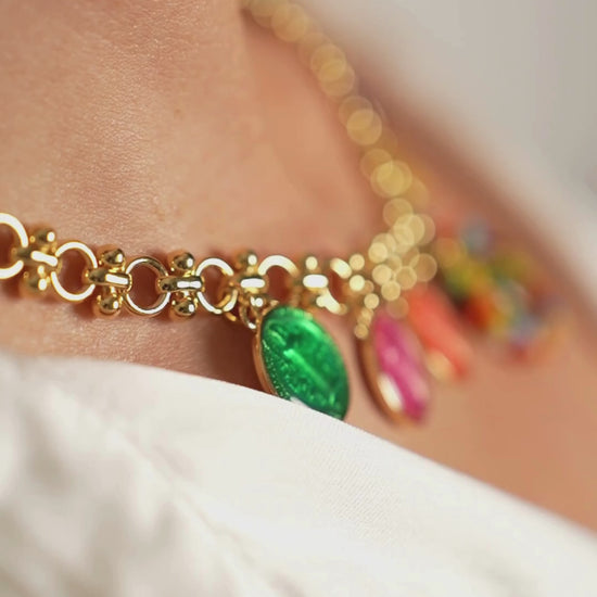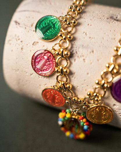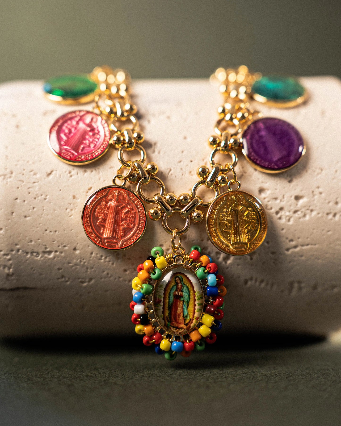 Carry spiritual strength and timeless beauty with you with this exclusive hand-painted, gold-plated Catholic necklace. Its sophisticated design features a link chain with Virgin of Guadalupe medals in vibrant enameled colors, evoking devotion and joy.