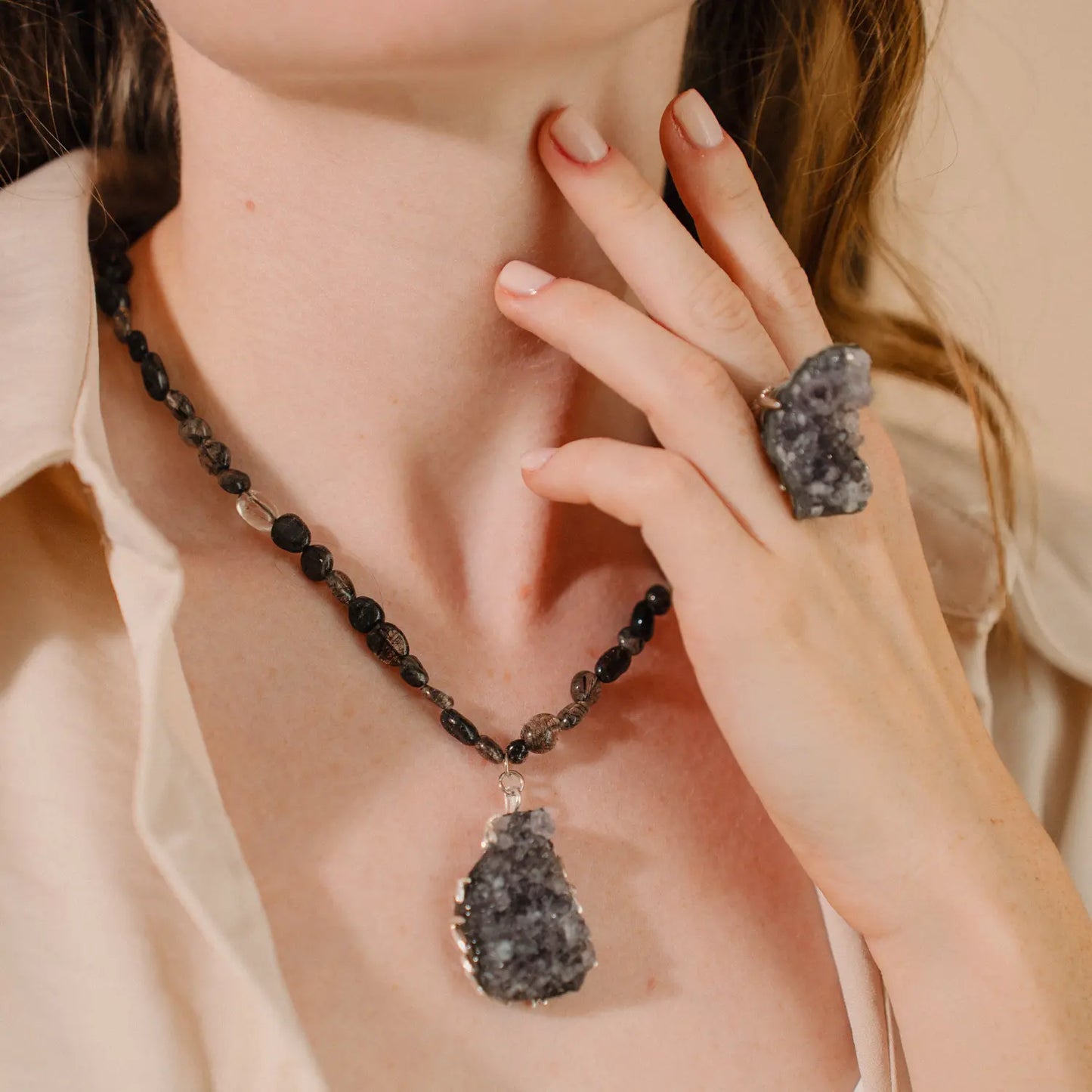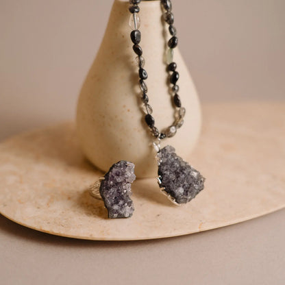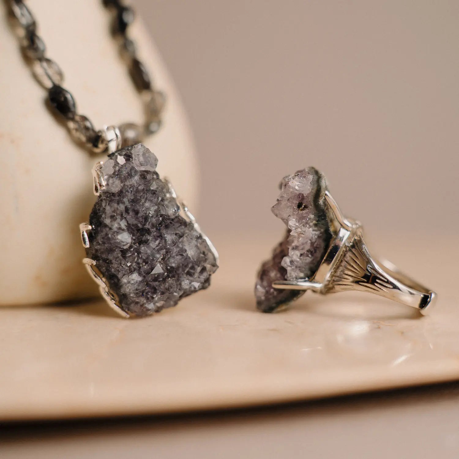 This set includes a necklace with a raw amethyst druzy pendant, hand-set in your choice of gold or silver plating, accompanied by a matching adjustable ring.