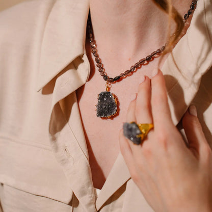 🖤 ​​Druzy and Smoky Quartz Bead Jewelry Set | Handmade Gold or Silver Setting