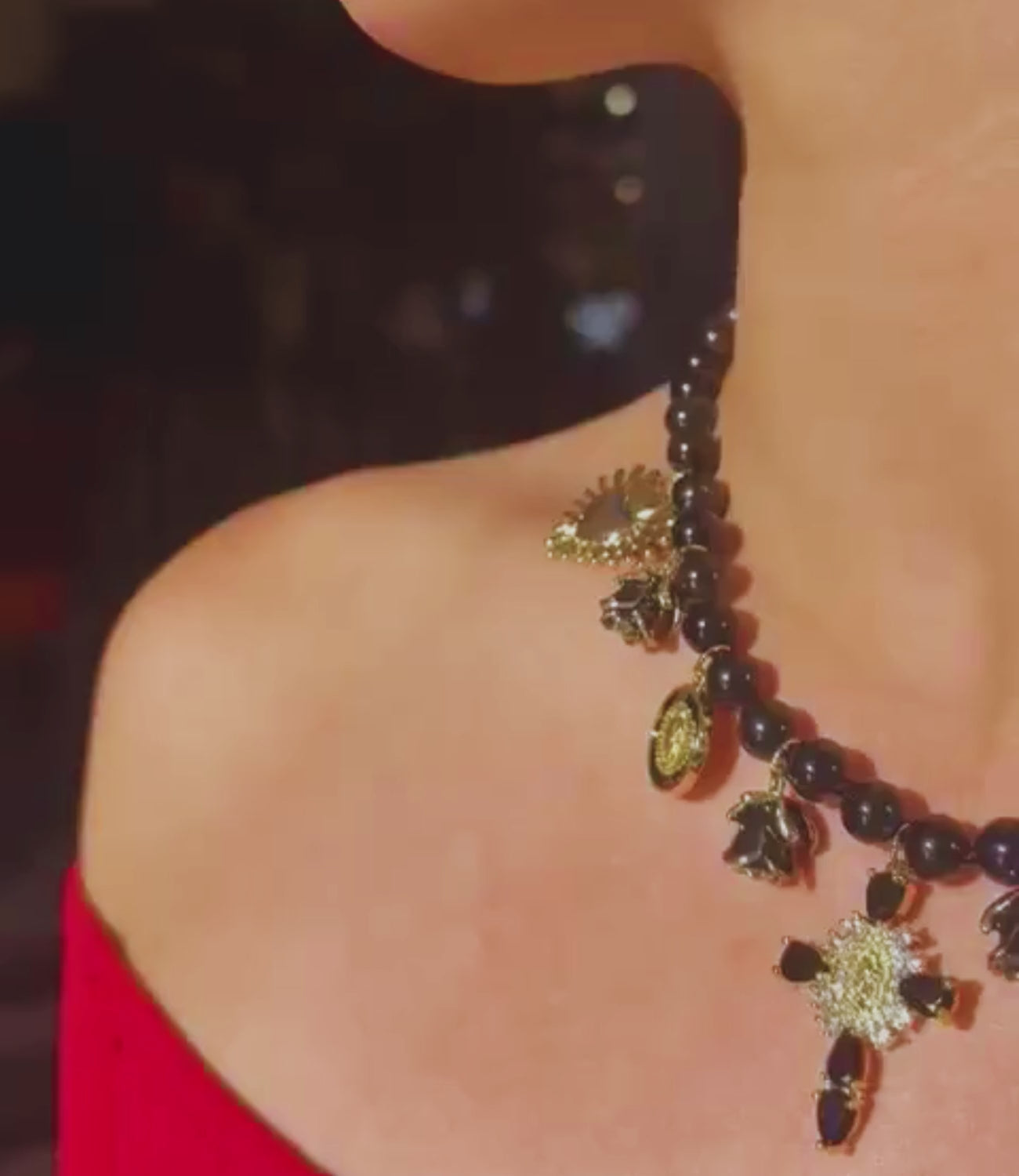 A design steeped in symbolism and elegance. This onyx bead necklace features a cross adorned with zircons in the center, framing the figure of the Virgin Mary, becoming the focal point of the piece. Surrounding it are delicate flower-shaped charms, black enameled Virgin Mary medals, and golden votive hearts, all crafted with meticulous detail.