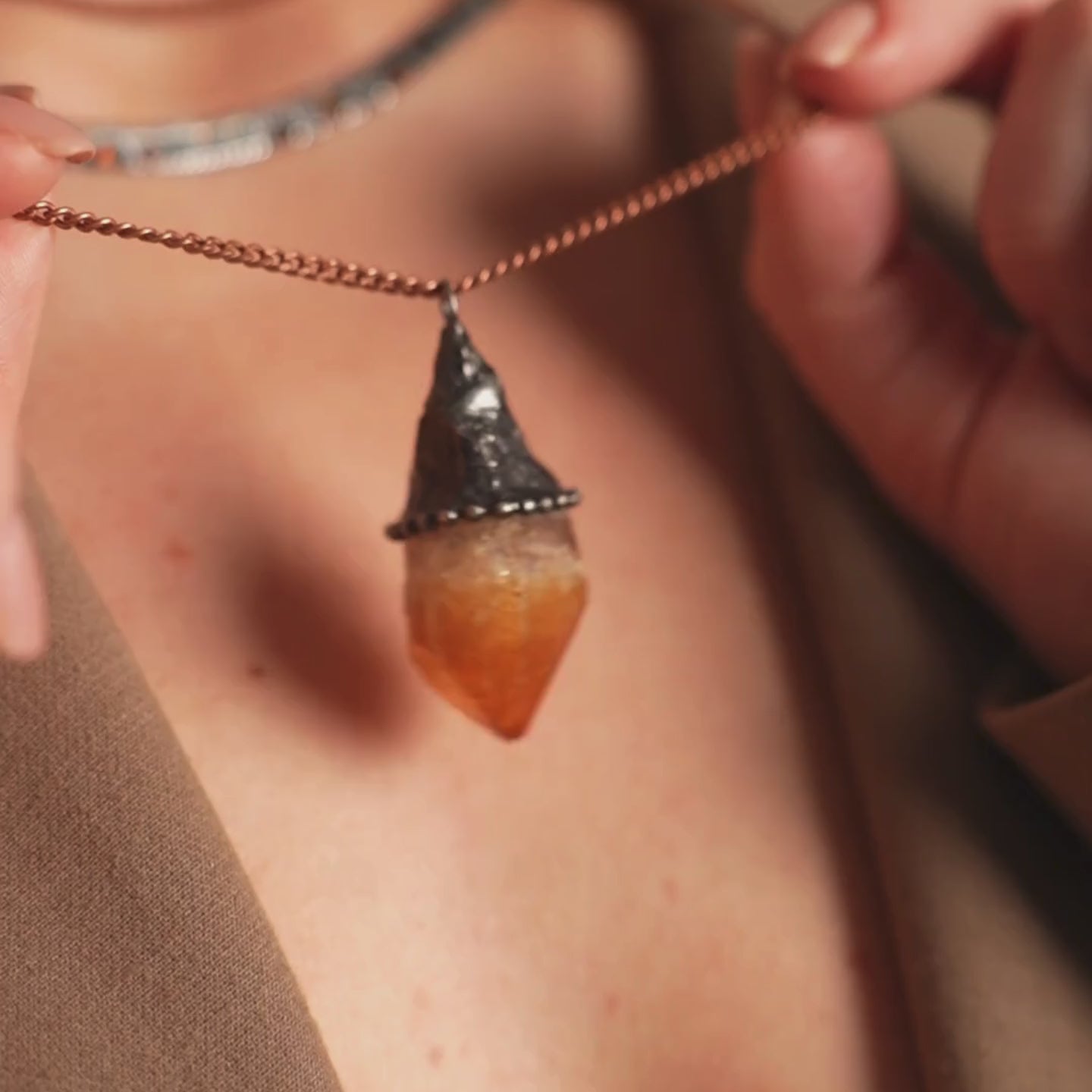 This Layered Necklace Mystic Citrine is a powerful combination of textures, metals and natural energy, designed for those looking for a bold and meaningful look. This multi-layered piece fuses the rustic with the sophisticated, incorporating a copper-plated chain, a snake-style necklace with an animal print and a mystical pendant of raw citrine, a stone known to attract prosperity and creativity.