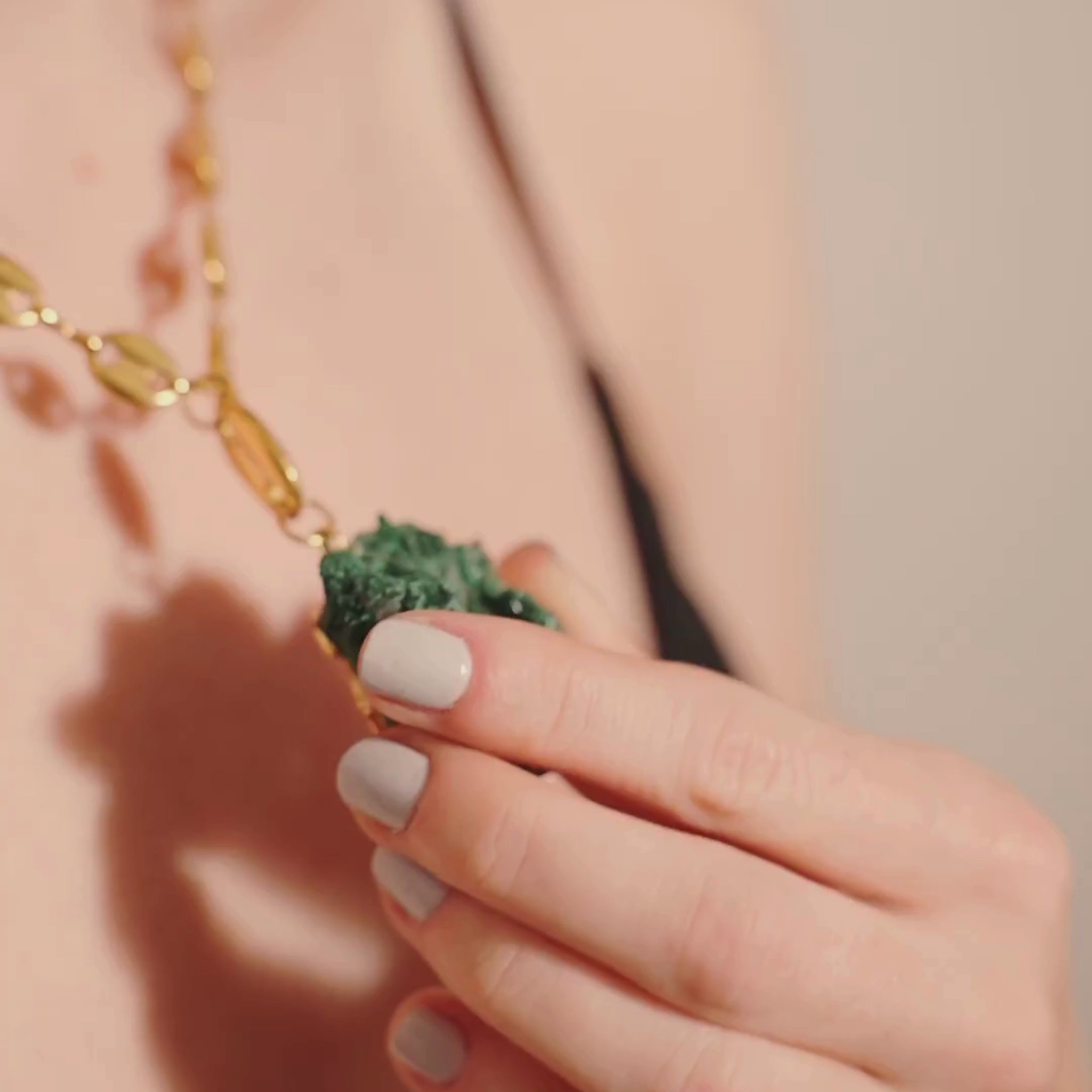 A bold design brimming with mineral energy. This necklace features a polished gold-plated link chain, providing strength and sophistication, accompanied by a stunning raw malachite pendant.