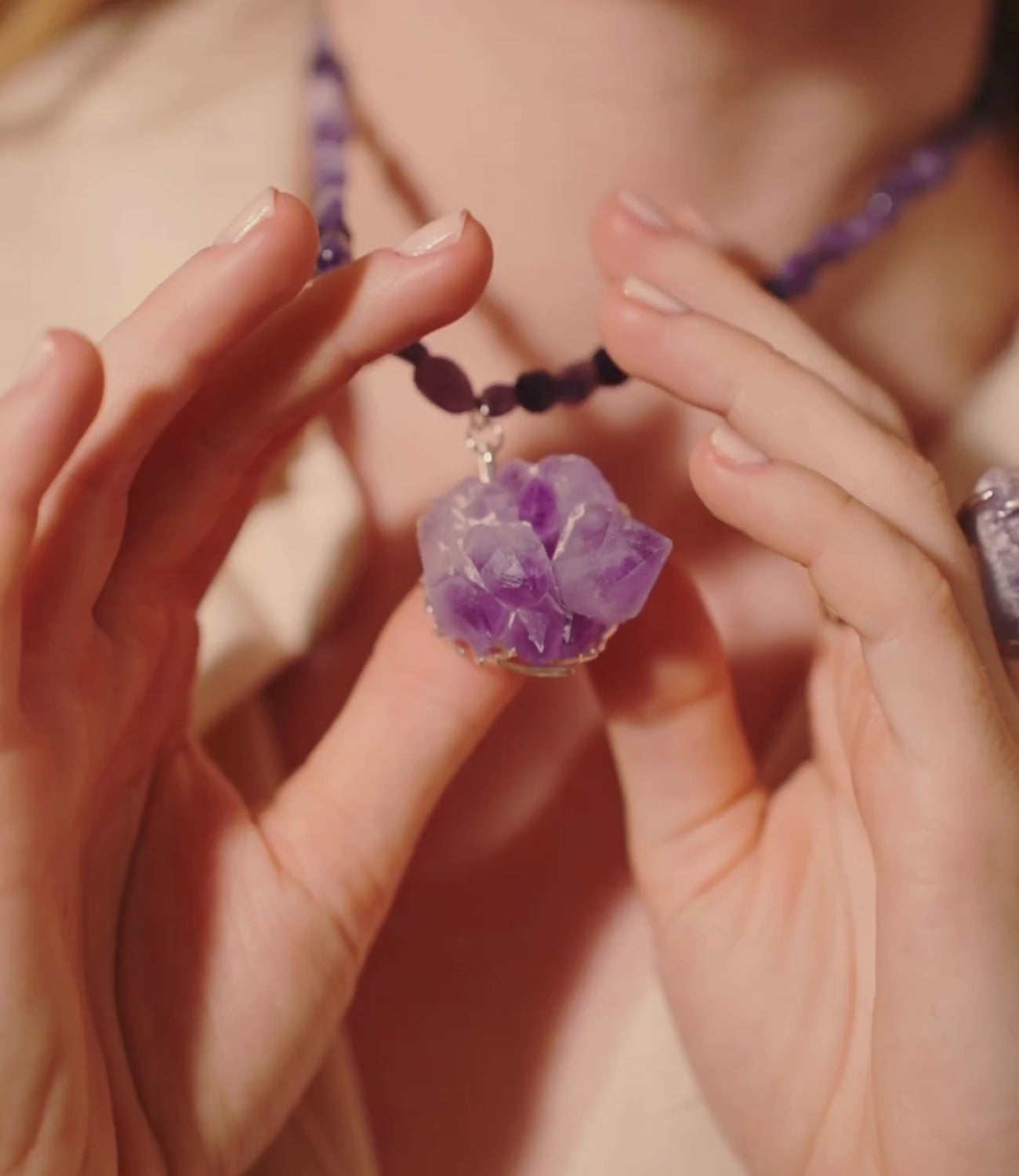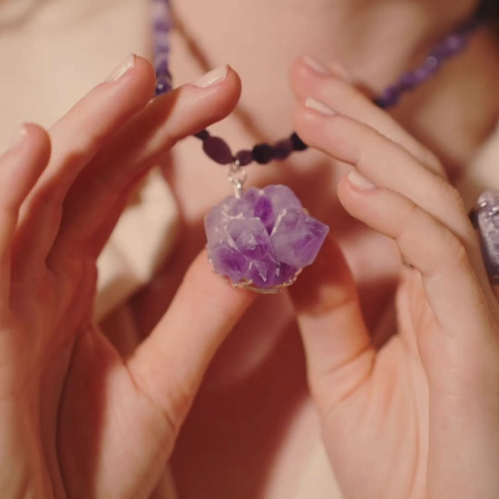 Necklace crafted with natural amethyst chips in various shades, carefully selected to highlight the stone's organic beauty. Its centerpiece is a stunning raw amethyst pendant, a symbol of wisdom and spiritual protection. Available in an 18k gold-plated or silver finish, this design is ideal for women seeking a mystical, elegant, and powerful touch. Each piece is unique, just like you.